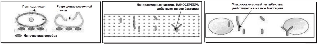 Серебро взаимодействует с внешними пептидогликанами, блокируя их способность передавать кислород внутрь клетки бактерии, что приводит к “удушению” микроорганизма и его гибели.