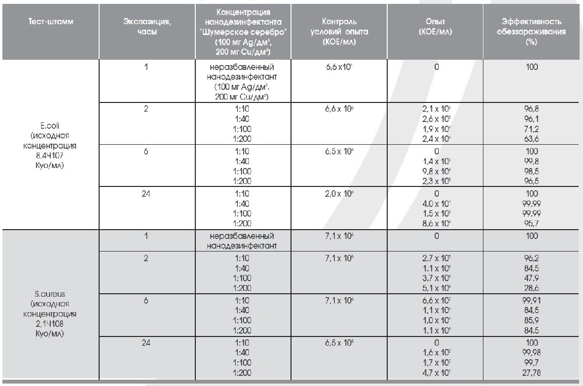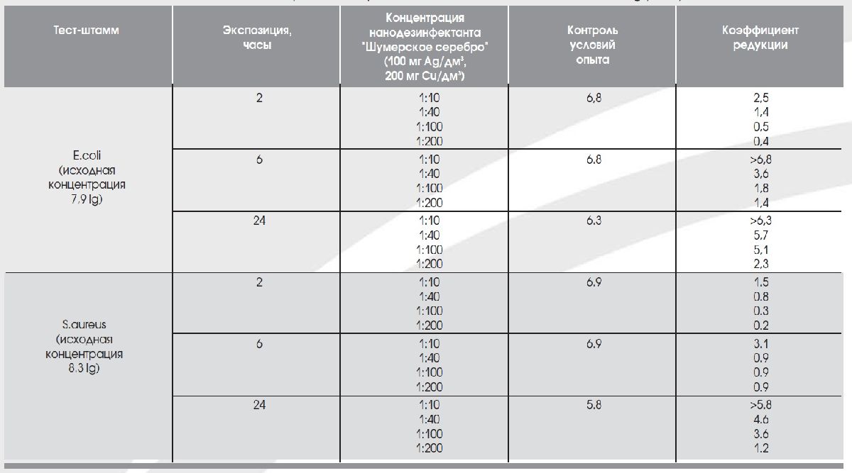 Таблица 2. Бактерицидная активность нанодезинфектанта “Шумерское серебро” в зависимости от концентрации и времени согласно (14)
