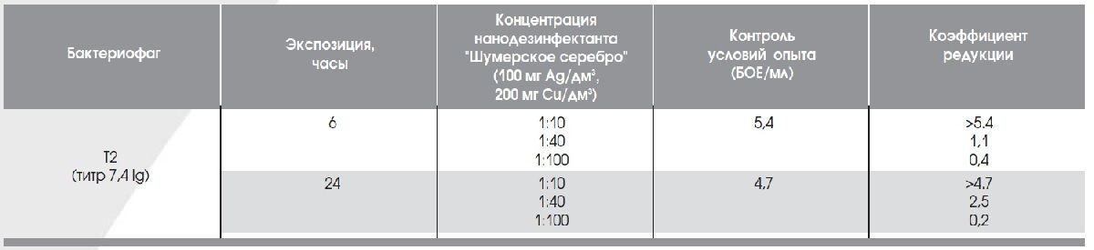 Как модель вирусов был использован соматический ДНК-колифаг Т2, концентрация которого в опыте составляла 2,6х107 БОЕ/мл (7,4 lg). Результаты исследования вирулицидной активности нанодезинфектанта “Шумерское серебро” представлены в табл. 4.